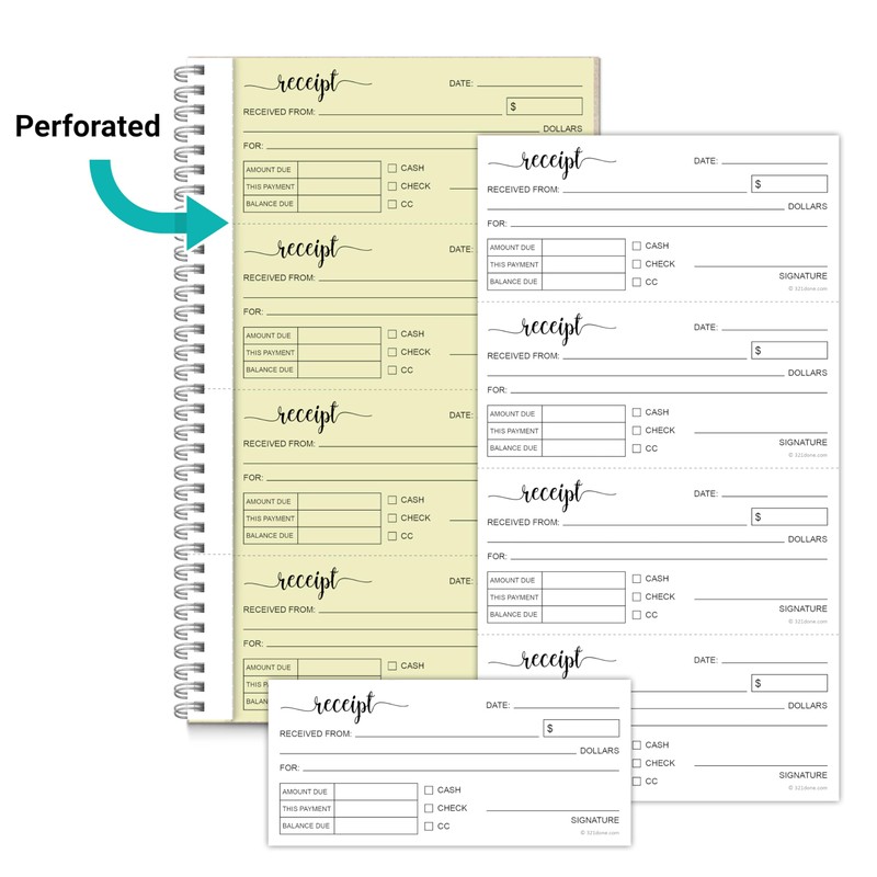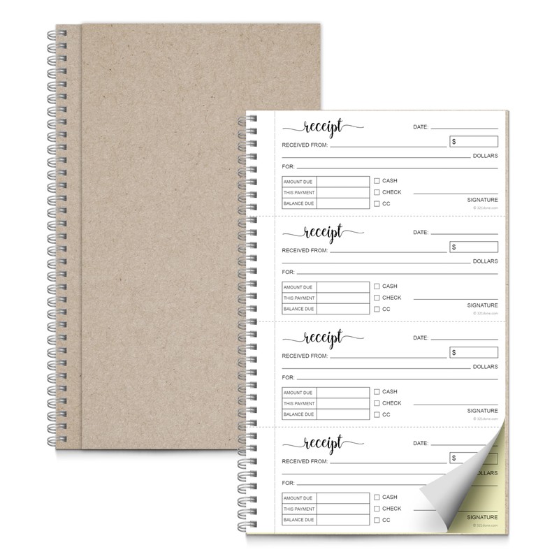 Our 2-Part Carbonless Spiral Receipt Book is a must-have tool for small businesses looking to keep track of their sales and expenses in an organized and efficient manner. Made in the USA, it is of the highest quality and is designed to meet the needs of small businesses and individuals alike. Measuring 11" x 7" inches, it's compact enough to carry with you wherever you go, yet large enough to accommodate all of your receipts. It's design allows you to make copies of each receipt, so you can keep one for your records and give one to your customer. This feature helps to minimize errors and ensures that your business is compliant with IRS regulations. The 4 receipts per page format allows for easy tracking of transactions, and with 50 white/yellow pages, you can keep track of up to 200 sets of receipts per book. The carbonless paper technology ensures that the writing on the top copy is transferred to the bottom copy without any smudging or bleeding, giving you clear and legible copies every time. Our Receipt Book is made of 20lb paper, making it durable and able to withstand the rigors of daily use. The spiral binding makes it easy to flip through pages, and the sturdy cover protects your receipts from damage. Carbonless forms don't have to be basic or boring! That's why 321Done's top-quality carbon copy notebooks are the choice of premier craft businesses, photographers, caterers, florists, bakeries, and boutiques alike.