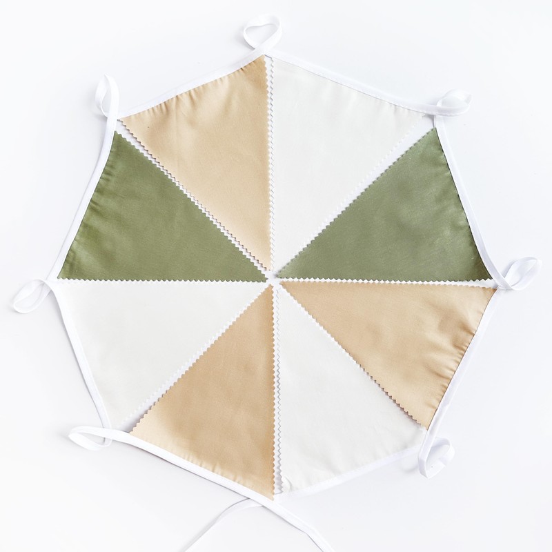 - Package Including:1 pack camping theme fabric bunting banner garland in light olive green, kraft tan brown and cream neutral colors, with 36pcs flags in 10M/32.8Feet. Flag Size: 5.5in width x 7in height.