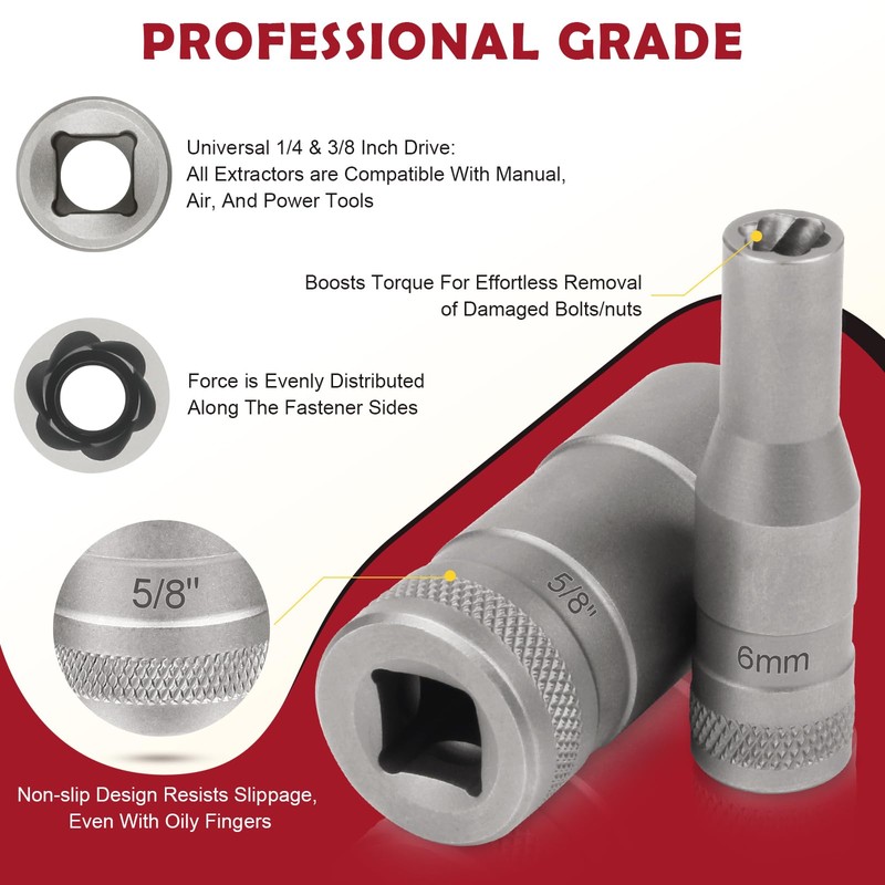 - 【PREMIUM DURABLE】: The complete bolt remover socket set is constructed from high-hardness CR-MO steel with a sandblasted finish, providing excellent durability and extended lifespan. It comes in a heavy-duty case for easy transport and identification.