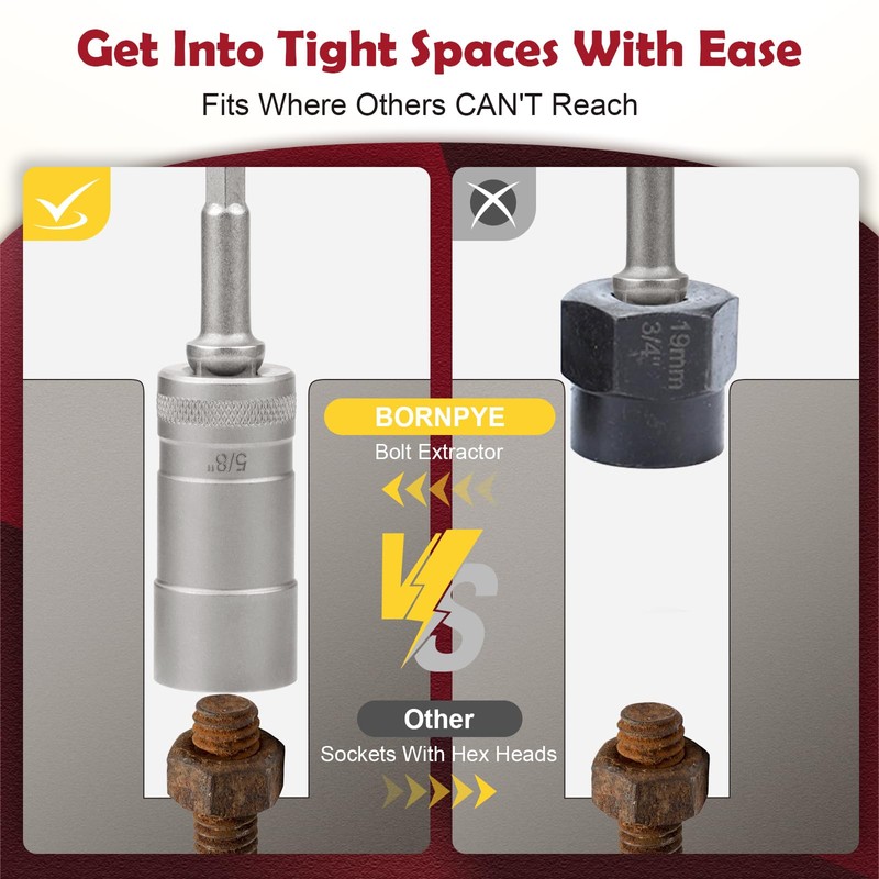 - 【Designed for narrow spaces】:Our extended lug nut removal tool socket set features a longer, slimmer profile of 33mm, length to reach narrow, deep, and tight spaces. This innovative design addresses the limitations of traditional hex extractors, allowing access to areas where other bolt extractors can’t reach.