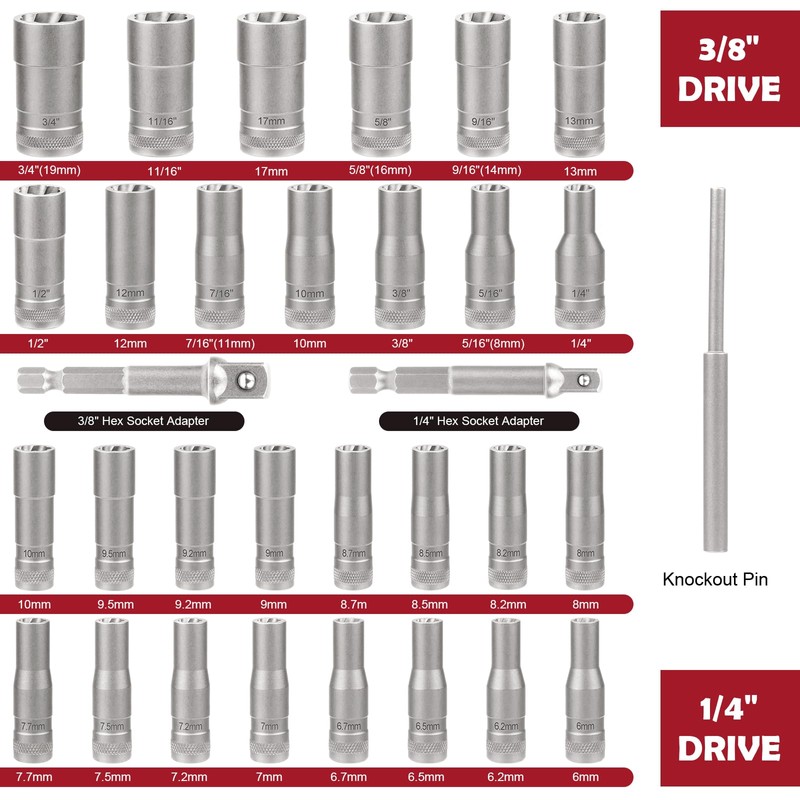 32Pcs Bolt Extractor Kit, 33mm elevated design, with 3/8, 1/4 Inch Adapter, Ez Out Deep Broken Lug Nut Removal Socket Set, Easy-Out Spark Plug Remover Tool, for Stripped Rusted Bolts, Stud, Nuts Screw