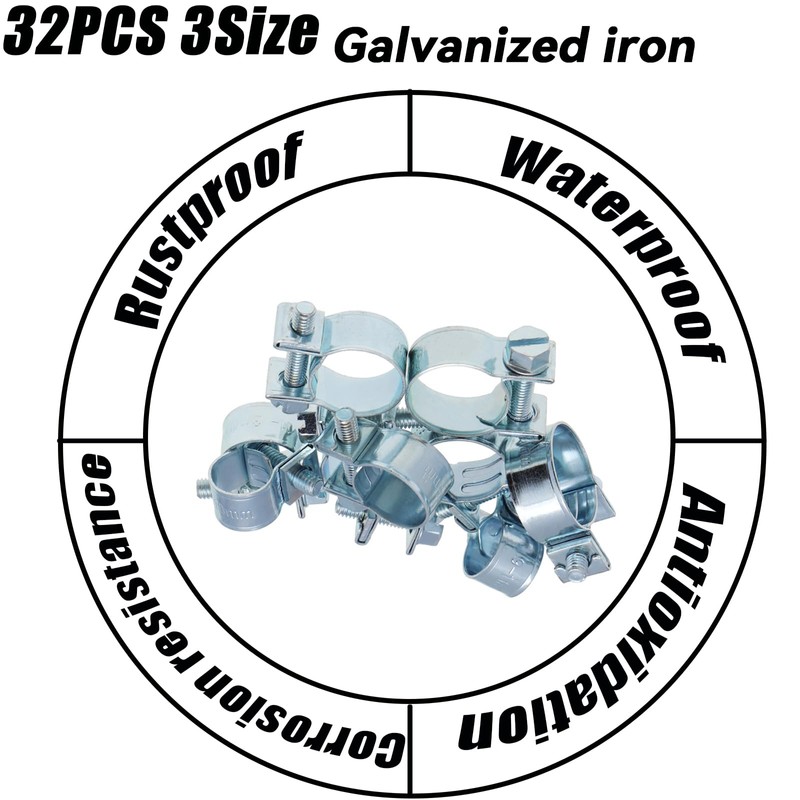 - 【Comprehensive Assortment】 – Includes 32 fuel line hose clamps in 3 common sizes: 1/4", 5/16", and 3/8", suitable for a wide range of automotive tubing and fuel lines.