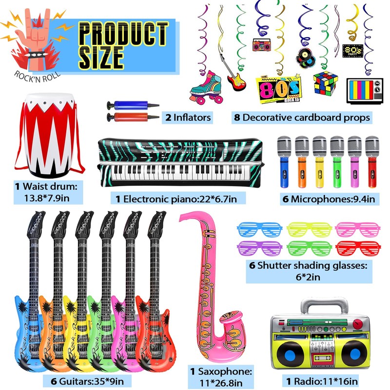 - 🎸【Great Value Toy Set】 Our neon inflatable instruments for parties set contains a total of 32 pieces: 6 guitars (35*9in) + 6 microphones + 6 shutter glasses + 1 electronic piano + 1 radio + 1 saxophone + 2 dozen Inflator + 8 pieces of spiral hanging ornaments.