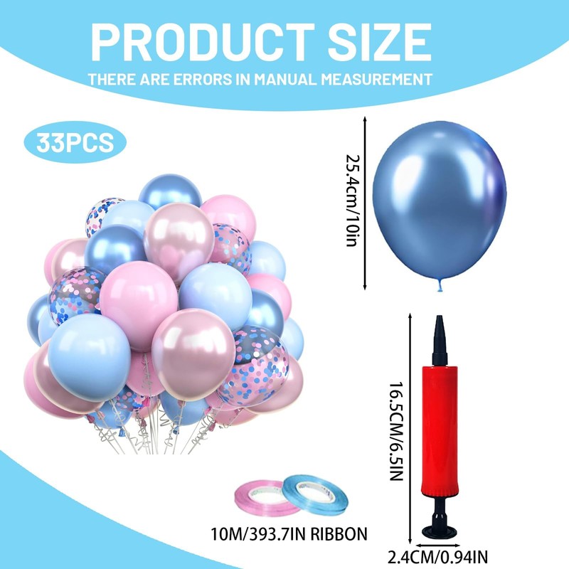 - Mixed Balloons Set: The 10 inch baby shower party confetti balloons set includes 6pcs macaron pink balloons, 6pcs macaron blue balloons, 6pcs metallic pink balloons, 6pcs metallic blue balloons,6pcs pink and blue confetti balloons, 2 roll of ribbon and 1Pump. 33pcs in total.