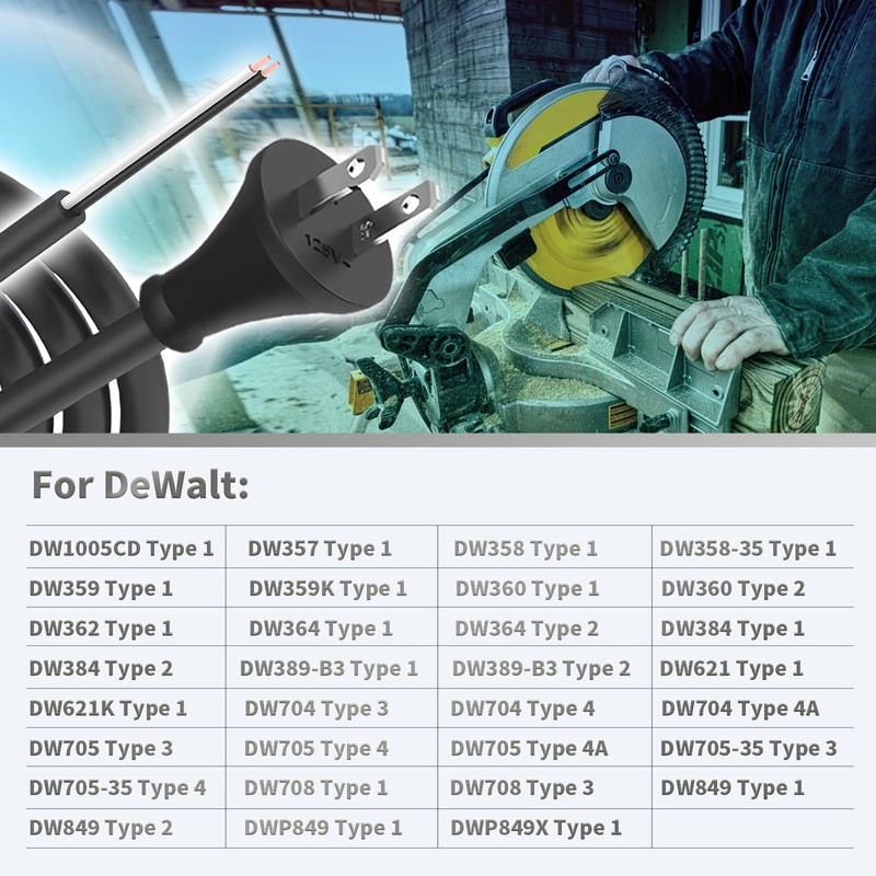- 33007898 power cord is compatible with Dewalt DW704, DW705, DW708, DW718, DW621, DW849, DW357, DW358, DW359, DW360, DW362, DW364, DW384, DWP849, DWP849X, 3338 2-1/4HP, 3338 2-1/4HP, 5021, 5027 Pavement Breaker, 3057 7 1/4, 3060 7 1/4 Saw Cat, 3064 7 1/4 Saw Cat, 1707 Cross-Cut, 1707 Cross-Cut, 6112-90 Disc Sander, 5059, 5018.