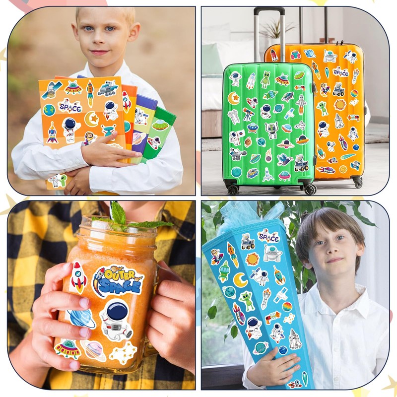 The space stickers for kids are great for decorating scrapbooks, envelopes, goodie bags, boxes, invitation cards, laptops, cell phones, skateboard, helmet, school bag, notebook, cups, phone and so on.