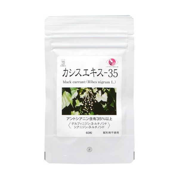 内容量素錠 6g(100mg×60粒)形態ラミジップ容器原材料カシスエキス末(国内製造)栄養成分表示 (3粒あたり)エネルギー : 1.18kcal、たんぱく質 : 0g、脂質 : 0g、炭水化物 : 0.28g、食塩相当量 : 0g