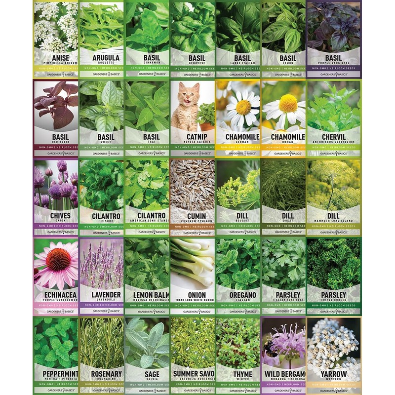 - 35 VARIETIES HERB SEEDS VARIETY PACK - 35 of our most popular herbal garden seeds, including Lavender, Echinacea, Chervil, Chamomile, Cilantro, Basil, Summer Savory, Anise, Dill, Rosemary, Peppermint, Sage, Thyme, Curled Parsley, Flat Parsley, Lemon Balm, Arugula, Bergamot, Yarrow, Green Onion, Cumin, Catnip, and Chives