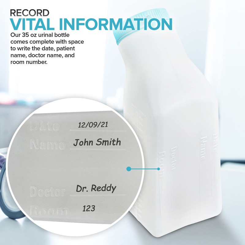 - Clear Measurement Lines: Our calibrated urinal bottle is embossed with easy-to-read numbers. Our urinal bottle has measurements in ounces from 1 ounce to 35 ounces in increments of 5. Our scale is also measured with milliliters in increments of 50 up to 1,000 ml.
