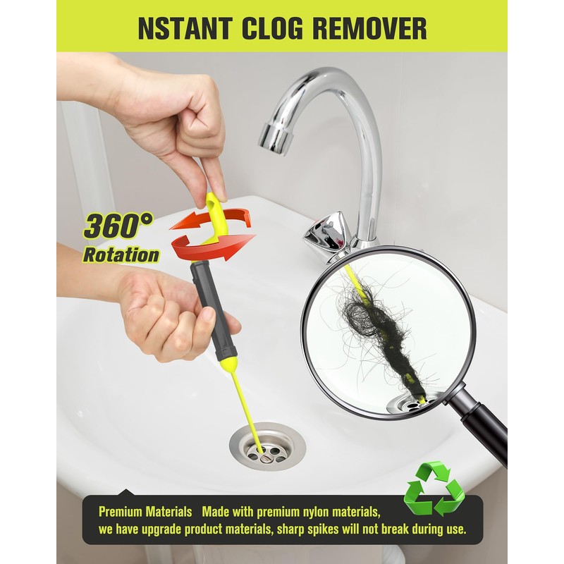 - 【SOFTER AND LONGER REACH】Drain cleaner hair clog remover measuring 35 inches in length can easily insert shower drain clog remover into pipes with loops or bends and pull out blockages from the most challenging areas. This sink snake is crafted from lightweight and flexible nylon material. After undergoing 210 tests, these drain hair remover tool do not break even in the tightest bends.