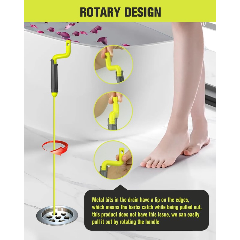 - 【REUSABLE ROTATING HANDLE DESIGN】 Previous shower drain hair catcher on the market often get stuck in the drain due to barbs or stubborn clogged. we have designed a reusable rotating handle that effortlessly resolves the problem. When plumbing snake stuck, simply rotating the handle allows for easy extraction without damaging your pipes or catching on drain parts.