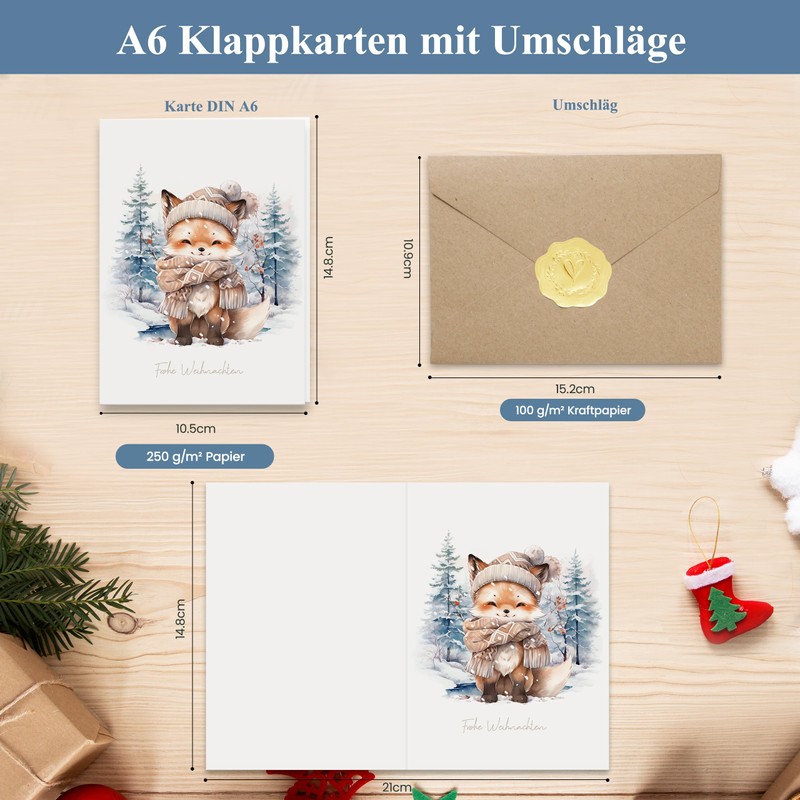 - 🎄High-quality materials and perfect size: the 36 cards are made of durable 250 g/m² card and have a standard A6 size of 14.8 x 10.5 cm when closed, which unfold to 21 x 14.8 cm. The 36 envelopes are made from 140 g/m² kraft paper and have a size of 15.2 x 10.9 cm. Write or print with any pen.