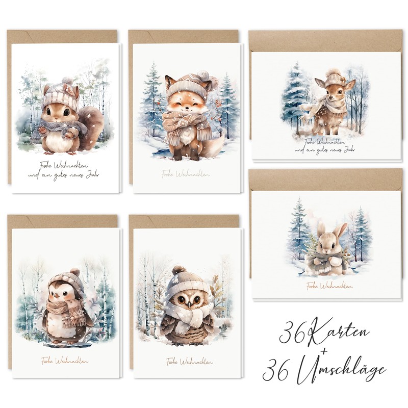 - Unique design: 36 watercolour cards with deer, foxes, rabbits, owls, squirrels and penguins. There are 6 cards for each animal pattern, ideal for personal or business Christmas greetings.