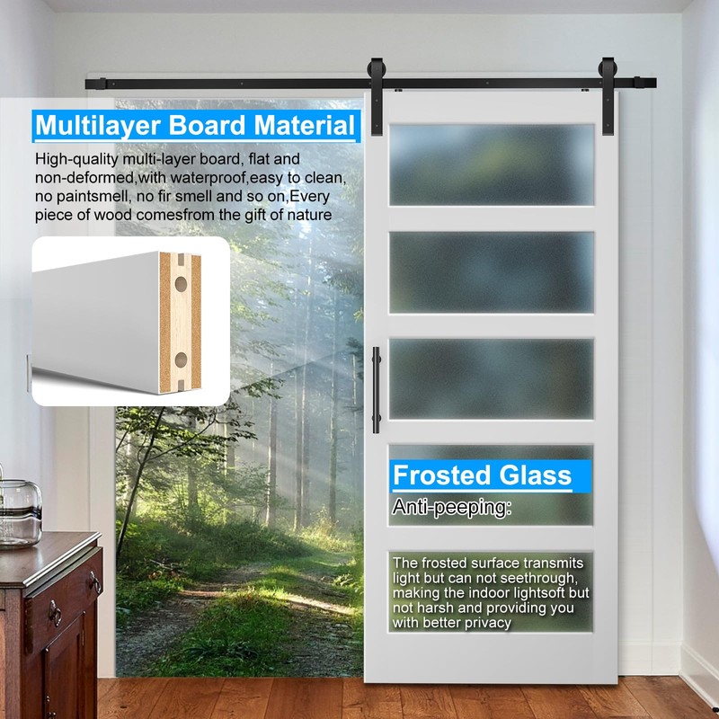 - 【High hardness Glass】 Frosted glass combines security and privacy.Tempered glass is more durable and also improves the inherent shortcomings of traditional wooden doors.Frosted glass interior barn door is made to allow natural light in,there is a sense of increasing space visually.
