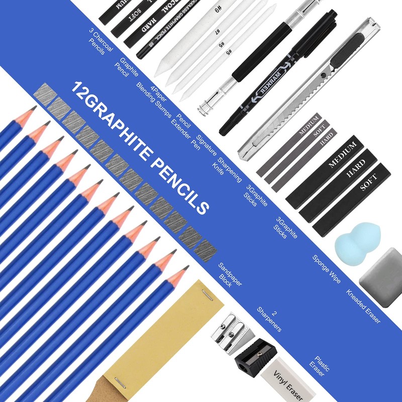 - 36-piece sketching drawing pencil set - sketching tool all-in-one set, offers a carefully selected selection of different sketching tools, including 12 graphite pencils, 3 charcoal pencils, 1 wood-less graphite pencil (6B), 3 graphite pencils, 3 charcoal pencils, 4 mixed paper stumps, 1 pen extender, 1 sandpaper, 2 ball sharpeners, 1 extender, 1 kneaded 1 sponge, etc