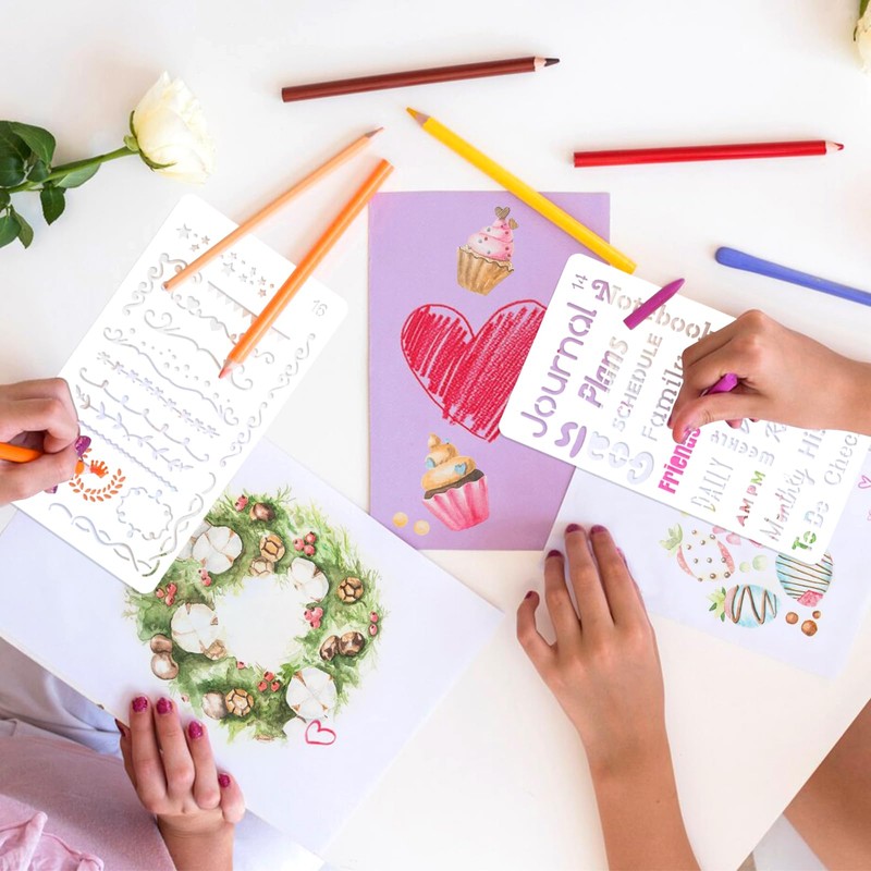 - 【Convenient & Versatile】Sized at 4 x 7 inches, these stencils are compatible with most journals, notebooks, and planners. Their versatility extends beyond journaling, they can be used for various DIY projects, such as crafting schedules, greeting cards, scrapbooking, or embellishing gift boxes,etc