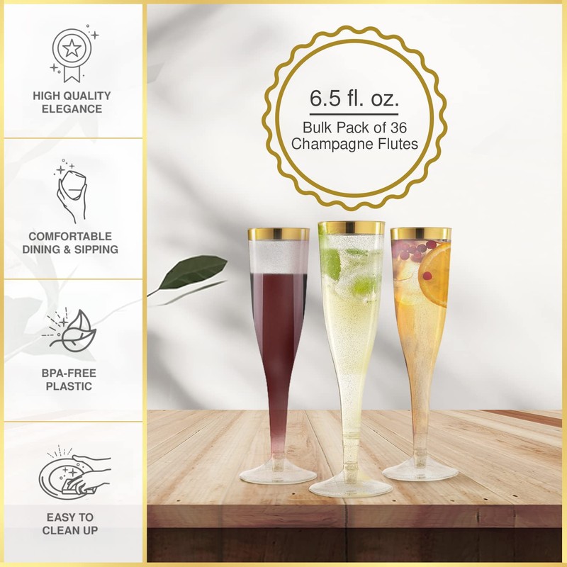 - PLASTIC CHAMPAGNE FLUTES DISPOSABLE OR REUSABLE: Chateau Fine Tableware plastic champagne glasses come in a convenient, 36-count package. After use, dispose of, recycle or hand wash plastic champagne flutes and plastic cocktail glasses for future events.