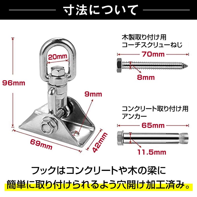Set of 2 rust resistant stainless steel (SUS304) swing hangers Wall and ceiling mounted swing hook, also as a hanging hardware for indoor or outdoor playground swings Application: Great for hanging chairs, kids swings, hammock, yoga hammock, suspension trainer, battle rope, gym equipment, boxing sand bag, yoga swing, hanging rings, etc. Pre-drilled for bolt or screw mounting to concrete or wood beams Includes 4 coach screws for mounting wood beams and 4 concrete anchors. Choose from a variation of 360 degree rotating type and short hook types. The hook load capacity is 400kg/pc.