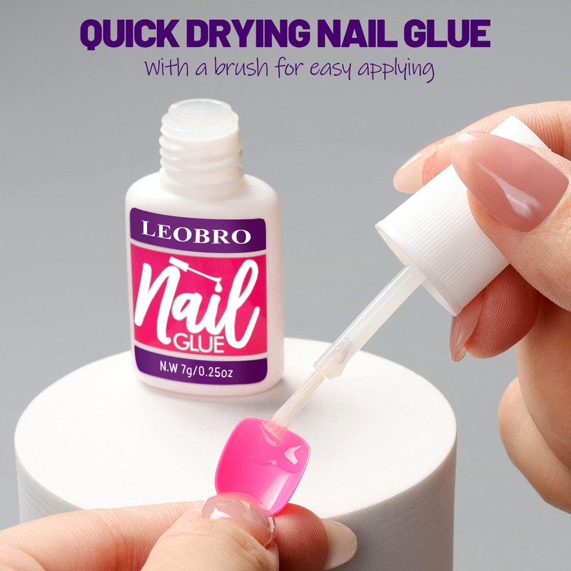 - False nails false nails with nail glue: 1 bottle of 7g/0.25 oz quick-drying nail glue, with strong adhesion, and with a brush for easy application, perfect for sticking the fake nails on your natural nails, or for adding nail art decorations such as nail stickers, rhinestones, nail glitter, nail flakes, nail foils, etc., on nails. Note: only 3/5 of the bottle filled to avoid leakage of the glue at high temperatures