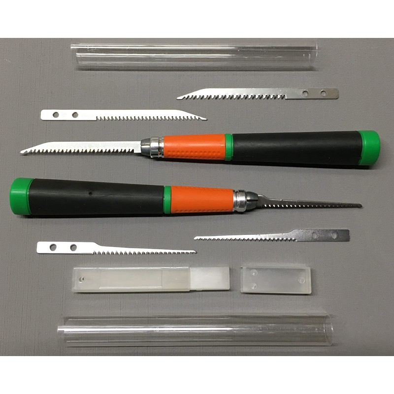 - Contains: (2) 360 Pumpkin Carving Saws. One equipped with a fast cutting stainless steel general use saw blade (larger teeth) and one equipped with a fine tooth stainless steel detail saw blade. (Handles and blades are interchangeable so user can use either blade with either or both handles). (1) Plastic blade storage box with (4) extra Stainless Steel Saw Blades.