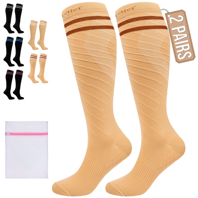 360 RELIEF 360 RELIEF 2 Pairs Compression Socks for Women Men, 15-20 mmHg Supports Blood Circulation, Travel Flight Socks, Varicose Veins, Pregnancy Stockings S/M, Beige with 2 Dark brown lines + Laundry Bag