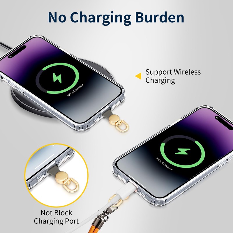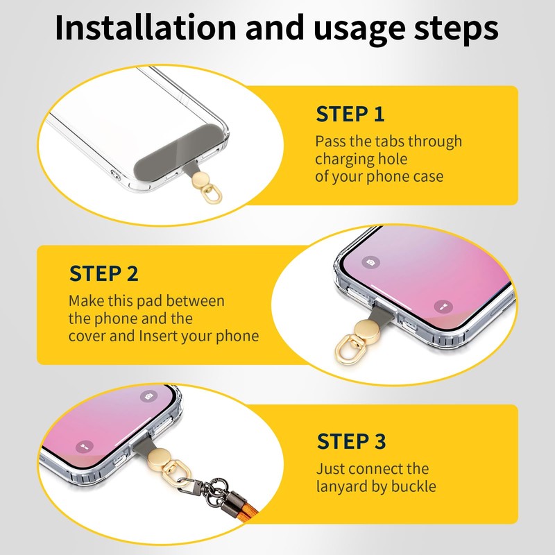 - 【Easy to Use and Not Block Charging Port 】The universal phone lanyard pad can be installed without tools, simply slip the pad through the charging hole, then insert your phone and attach the lanyard; This small item can help to release your hands . What's more, ultra-thin pad won't clog your charging hole, making you charge your phone easily. The lanyard mentioned above is not concluded in the package.