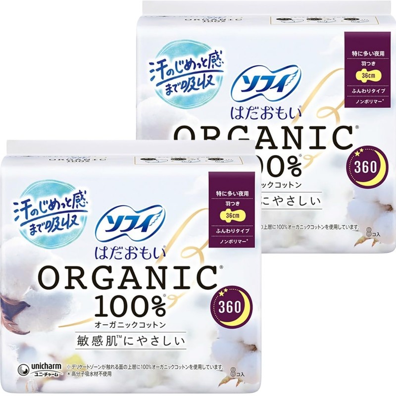 ソフィ はだおもい オーガニックコットン 特に多い夜用 羽つき 36cm (8個入×2袋セット) 生理用品 ナプキン まとめ買い ウェットティッシュ付き
