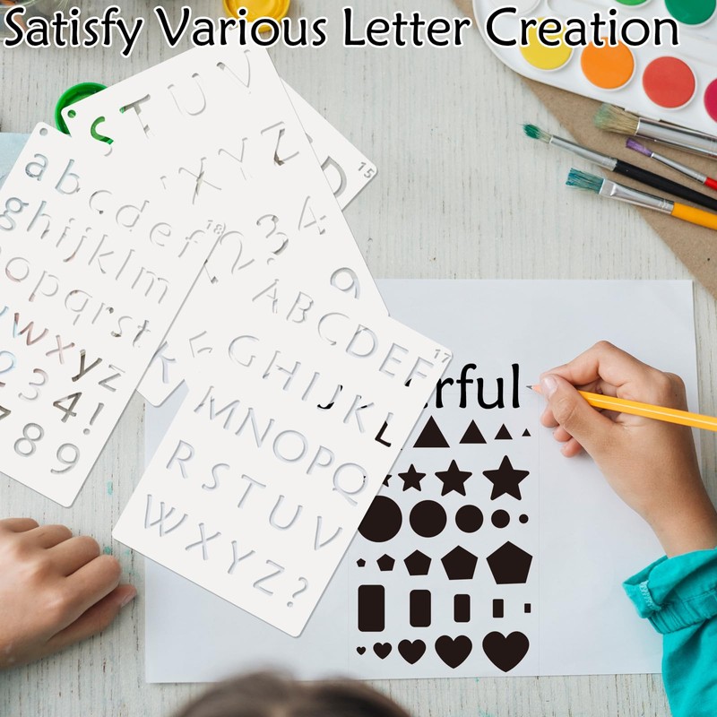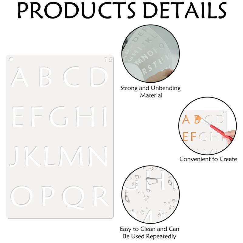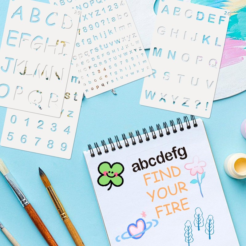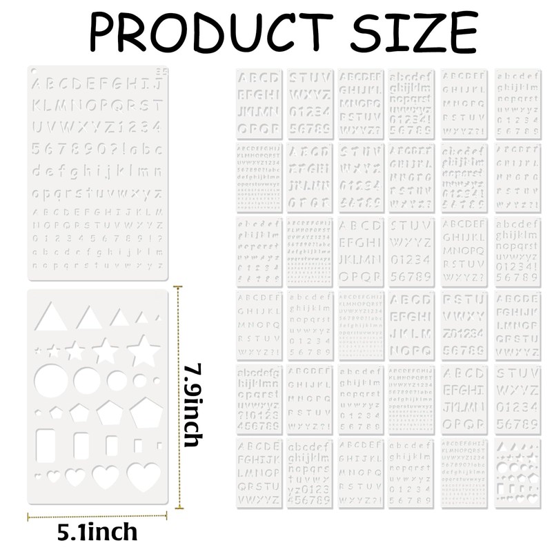 ----This stencils for painting has various writing styles of uppercase and lowercase letters and number templates, including standard fonts, cursive English, italic English, cute fonts, and simple pattern templates.<br>