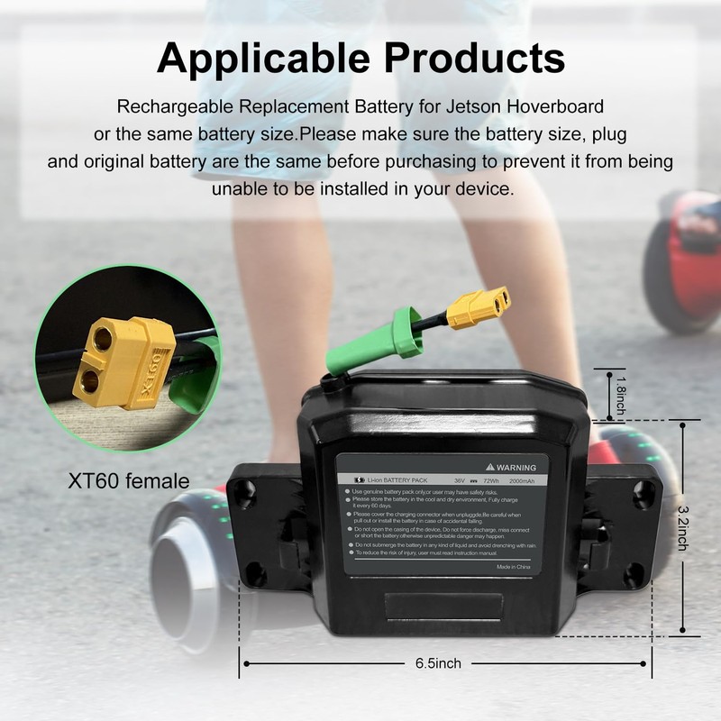 - Precise Compatibility: Dimensions: 6.5 x 3.2 x 1.8 inches. Plug is XT60 female, Designed specifically for 36V 2Ah 72Wh hoverboards, Compatible with Jetson Hoverboard Battery, this replacement battery ensures perfect fit and seamless integration with your device. Check the battery size and voltage to ensure compatibility before purchase.