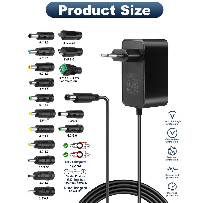 36W 12V 3A Power Supply, 12V 1A 2A 3A AC DC Power Supply with 9 DC Plugs