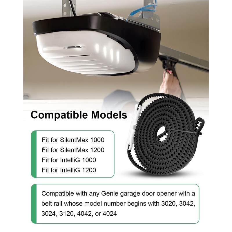 - Wide Compatibility: The garage door belt fit for SilentMax 1000 1200 & IntelliG 1000 1200; Compatible with any Genie garage door opener with a belt rail whose model number begins with 3020, 3042, 3024, 3120, 4042, or 4024, making it a convenient replacement option