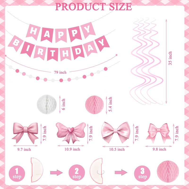 - Package Included: you can get 1 set happy birthday banner, 8pcs bow shaped cards in 4 styles, 2Pcs white and 4Pcs pink honeycomb balls, 10Pcs single hanging swirls and 1Pcs dot garland. It meets needs for a delightful birthday celebration setup