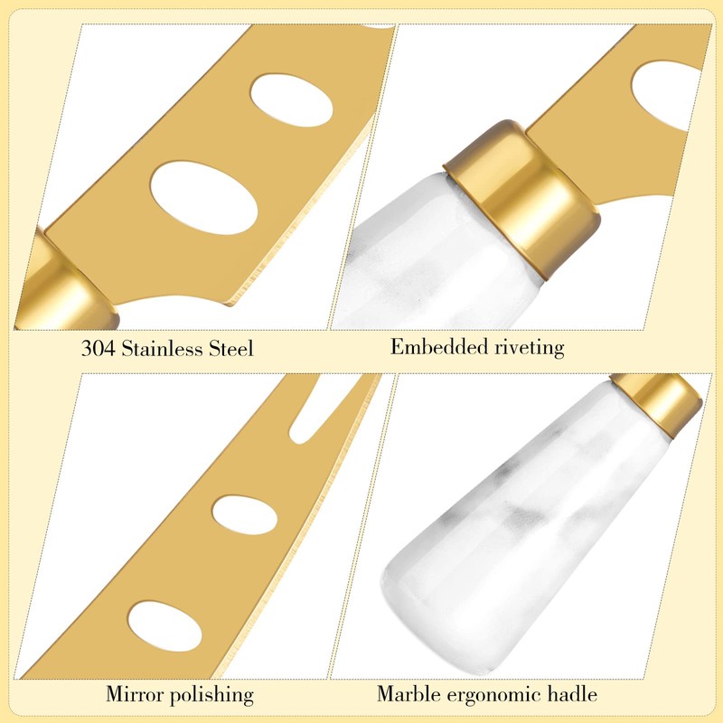 - Gold Cheese Knife Set: the marble knife set is designed with marble handle, which look elegant and beautiful, with nice texture, can be easily sliced with hard cheese and coated with soft cheese, you can use them for butter,, cheese and other dipping sauces, can bringing a lot of convenience for your kitchen items
