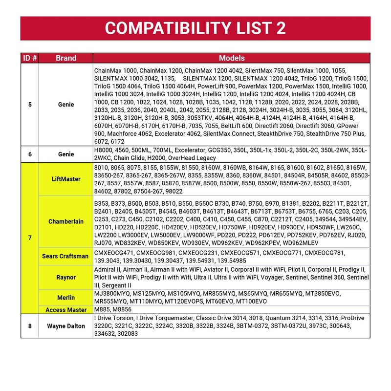 - Garage Door Opener Keypad compatible with Chamberlain, Sears Craftsman, LiftMaster, Master Mechanic, Genie Intellicode, Overhead Door, Wayne Dalton or Linear garage door openers with Smart/Learn button. Compatibility of models is indicated in the photo. NOTE: CAN'T support Dip Switch ones.