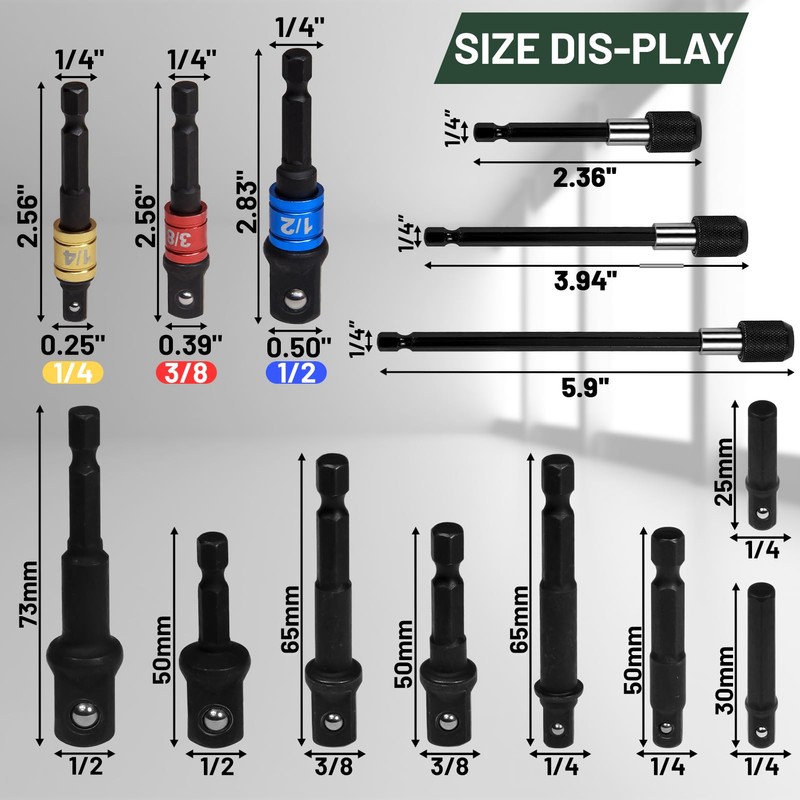 - 【Socket Adapter&360°Rotatable Impact Bit】 3 color (1/2, 3/8, 1/4) socket adapter and 3x360°rotatable socket adapters, each with a 1/4 hex drill bit. The 360°rotatable bit used special spherical design, which can evenly distribute power on a greater surface area, allowing it to access a narrower area.