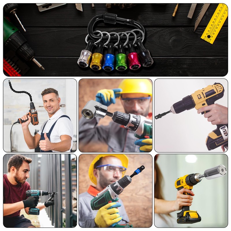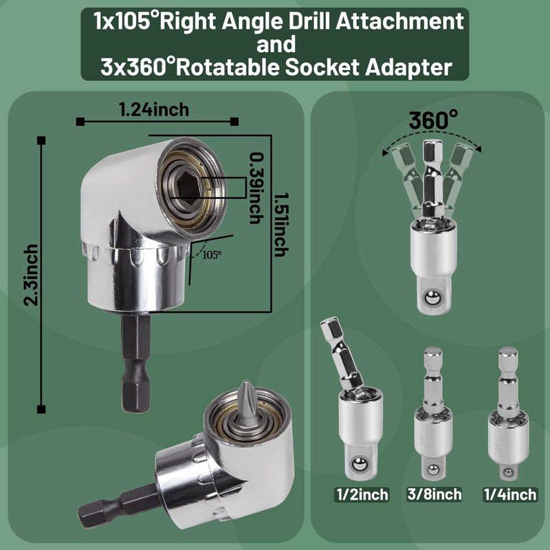 - 【Drill Extension Kit】 Include 2Pcs bendable flexible drill extension, 1Pcs screwdriver bits holder Set(6Colors 1/4 hex shank), 1Pcs 105° right-angle drill bit extension, 1Pcs universal socket wrench set, 3Pcs 1/4" 3/8" 1/2" socket adapter set, 3Pcs 360° rotatable impact driver bit set, 3Pcs hex shank magnetic screw driver bit, 8Pcs hex shank impact driver socket adapters, 10pcs in 1set combination screwdriver bit set.