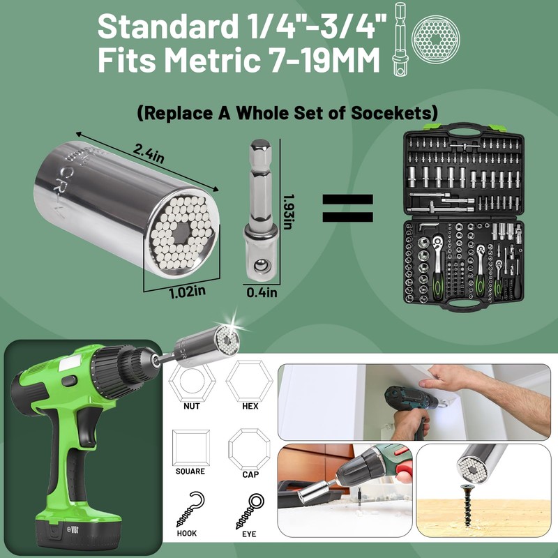 - 【105°Right Angle Drill & Socket Wrench】 You can connect the drill, charge the drill or manual wrench to extend it to hard-to-reach narrow places for flexible installation work. Universal socket wrenches automatically adjust to any size or shape and are suitable for standard 1/4 to 3/4 inch nuts, screws and bolts for most general maintenance.