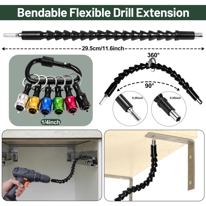 - 【Flexible Drill Extension&Bits Holder Set】 Flexible drill extension can be twisted and rotated at different angles, can be drilled into small spaces or various gaps to work, and easy to carry, fully matched to meet daily needs. Keychain screwdriver bits holder set is suitable for 1/4 "quick hex shank and 1/4" hex socket. You can carry all the small drill bits with you for quick replacement.