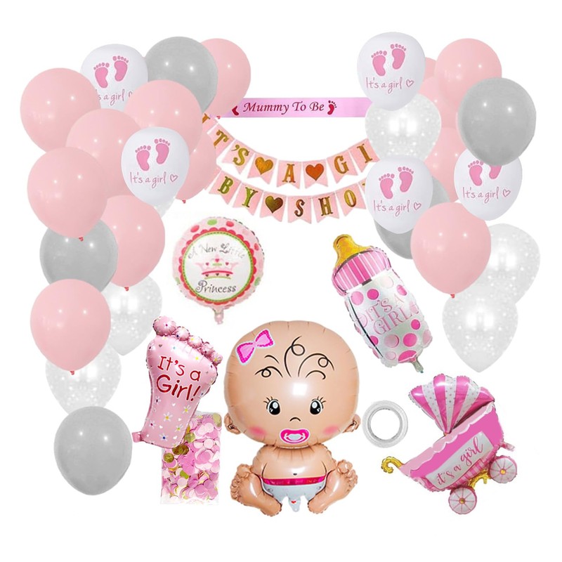 - [Product contents] You will receive 39 pieces pink baby shower balloon decoration set and 10 g pink confetti, including 1 piece baby girl pull flag, 1 piece mother shoulder strap, 1 roll balloon ribbon, 1 piece baby foot balloon, 1 piece pram balloon, 1 baby girl balloons, 1 baby bottle balloon, 1 crown balloon, 1 love balloon, 30 round 1.