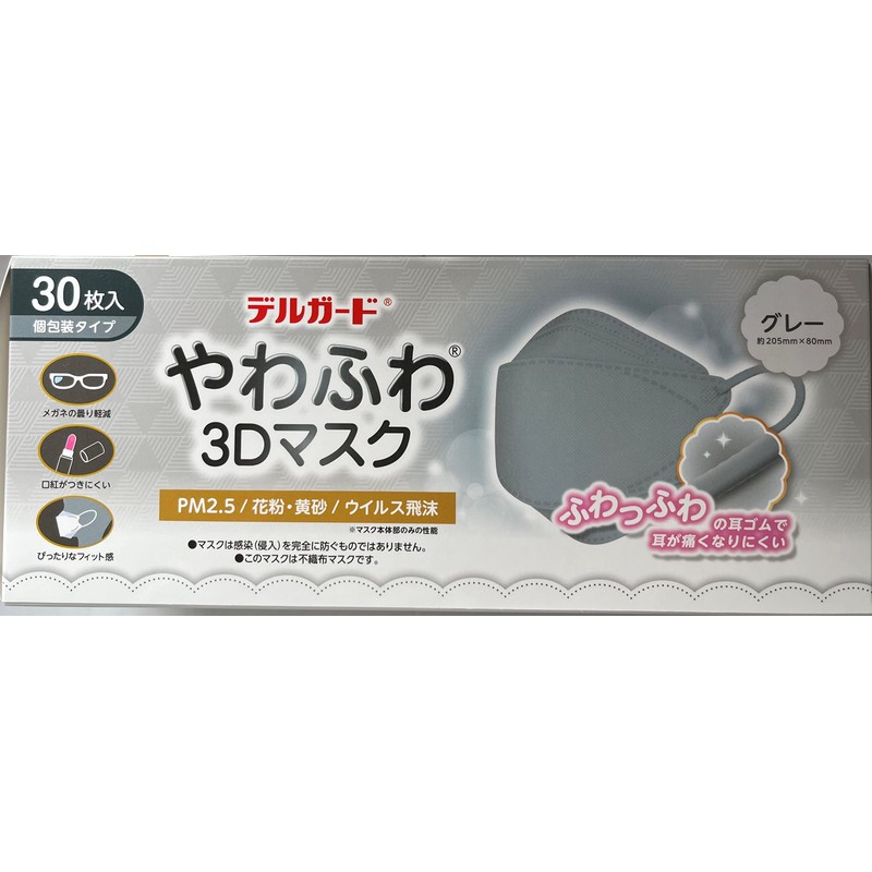 [阿蘇製薬] デルガード やわふわ3Dマスク グレー フリーサイズ 30枚入 個包装タイプ