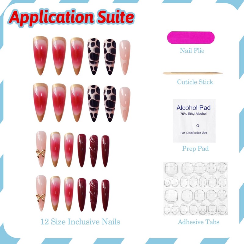 Package Contents: 24pcs false nails,24pcs Jelly glue, 1pc wood stick, 1pc mini nail file, 1pc alcohol pads.