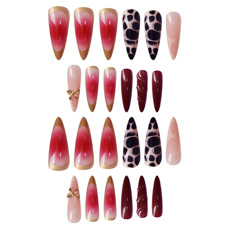 3D Almond Press on Nails Long Gold Curve Line Fake Nails French Tip False Nails with Bow Leopard Print Designs Pink Gradient Almond Glue on Nails Stick on Nails for Women Girls 24Pcs