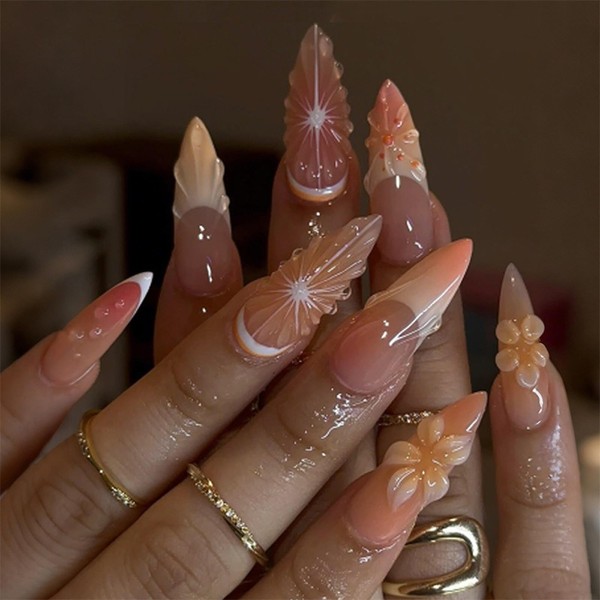 3D Almond Press on Nails Medium Length Fake Nails Gradient French Stick on Nails with Orange&flower Design Glue on Nails Glossy Acrylic False Nails Full Cover Artificial Nails Kit for Women Girl 24Pcs