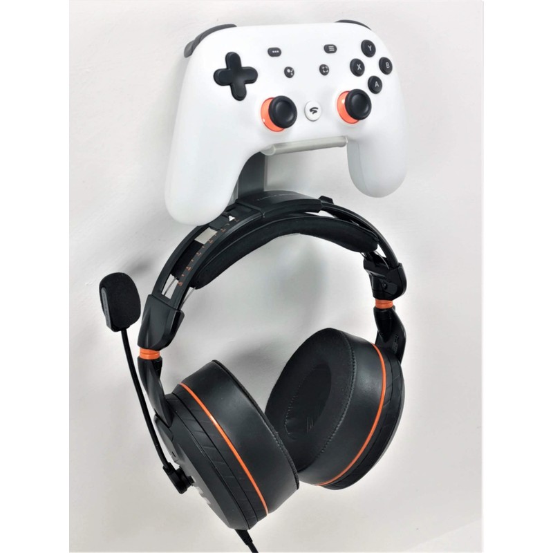 - 3D Cabin Product Compatible with Google Stadia Controller Wall Bracket Wall Mount With Headphone Hanger Holder (Grey). A sleek discreet two peice bracket to mount the google stadia controller and a pair of headphones or earphones on the wall. Minimal / floating look.