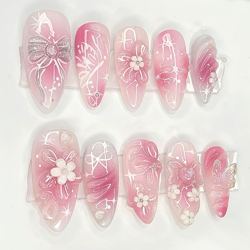 3D Flower Summer Press on Nails Medium Almond Fake Nails with Flowers Butterfly Designs Stick on Nail Bow False Nails Rhinestones Full Cover Acrylic Reusable Cute Nail Suitable Women Daily Wear