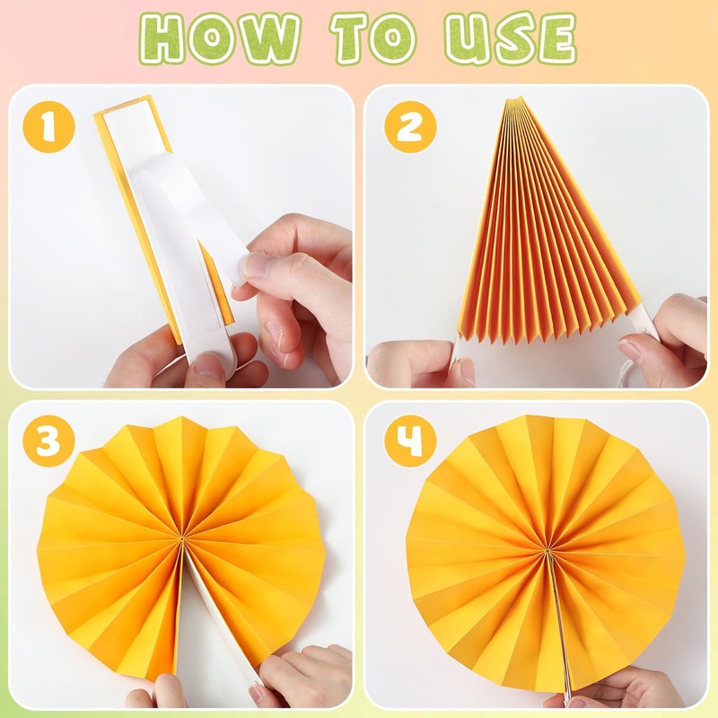 17 x paper fans(pink 25cm x1, 20cm x1, 15cm x1, light green 25cm x1, 20cm x2, 15cm x1, grass green 20cm x1, 15cm x1, yellow 20cm x1, 15cm x1, light yellow 20cm x1, 15cm x3, dark blue 15cm x2)