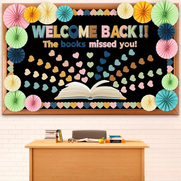 - Package includes: The boho welcome back bulletin board set includes 13 “WELCOME BACK!!” letter title, 4 “The books missed you!” letter title, 1 large book cutout, 52 heart cutouts, 16 boho heart bulletin board border, 4 sheets of adhesive dots, and 17 paper fans decorations(6 colors and 3 sizes).