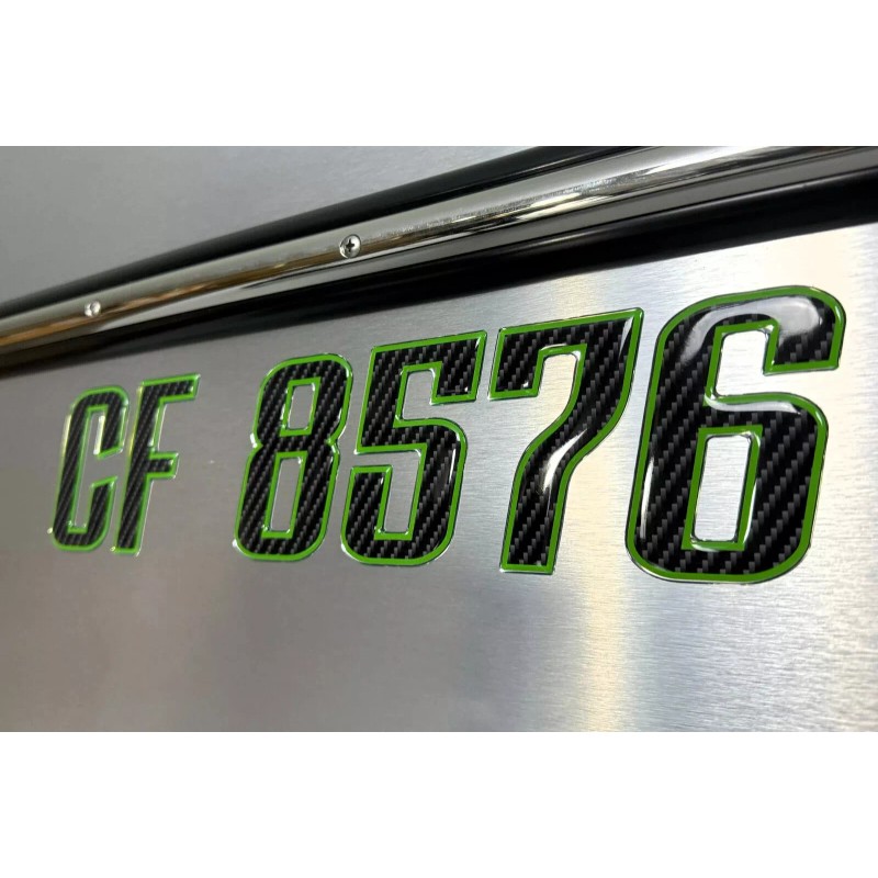 3D Lettering Boat Registration Stickers - Domed Carbon Fiber Numbers with Green Trim