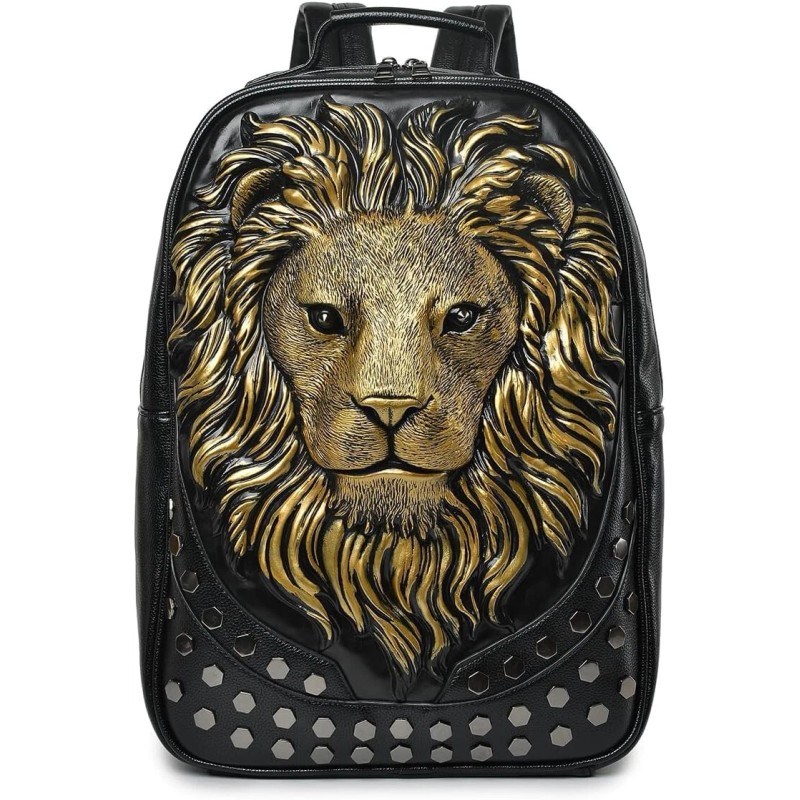 3D Lion Backpack Designer Vegan Leather Rivets Black Gold Large Unique New