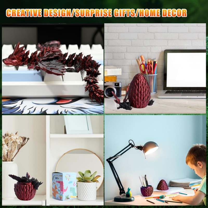 - Features: crystal dragon egg and movable dragon. Immerse yourself in the magic of this environmentally friendly 3D Printed Dragon in Egg, which features a movable construction and exquisite details. Adorned with an artfully designed crystal dragon and a fascinating dragon egg, this vibrant decor piece brings a radiance of mysticism and positivity to your home.